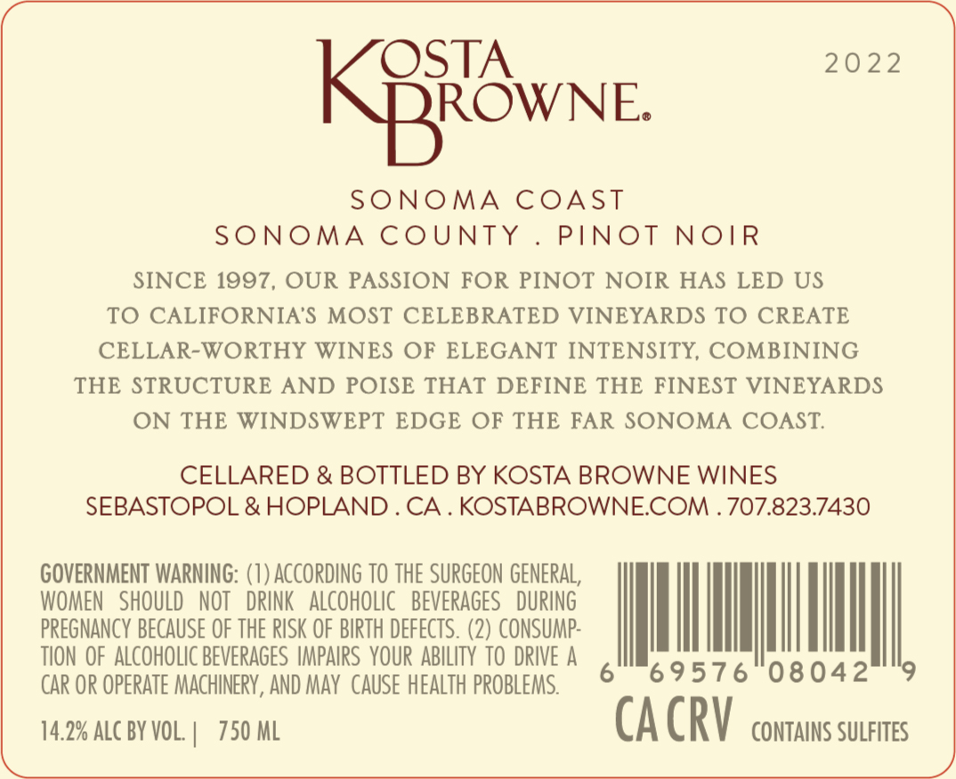 Kosta Browne Sonoma County Pinot Noir is a sophisticated and expressive wine that showcases the diverse terroirs of Sonoma County. This Pinot Noir offers rich, layered flavors of dark cherry, blackberry, and plum, accented by notes of rose petal, spice, and a touch of earthiness. The wine’s balanced acidity and smooth tannins provide a harmonious and elegant mouthfeel, making it a versatile pairing for dishes such as roasted duck, lamb, and creamy mushroom pasta. Crafted with meticulous attention to detail, Kosta Browne’s Pinot Noir embodies the artistry and passion that go into every bottle.